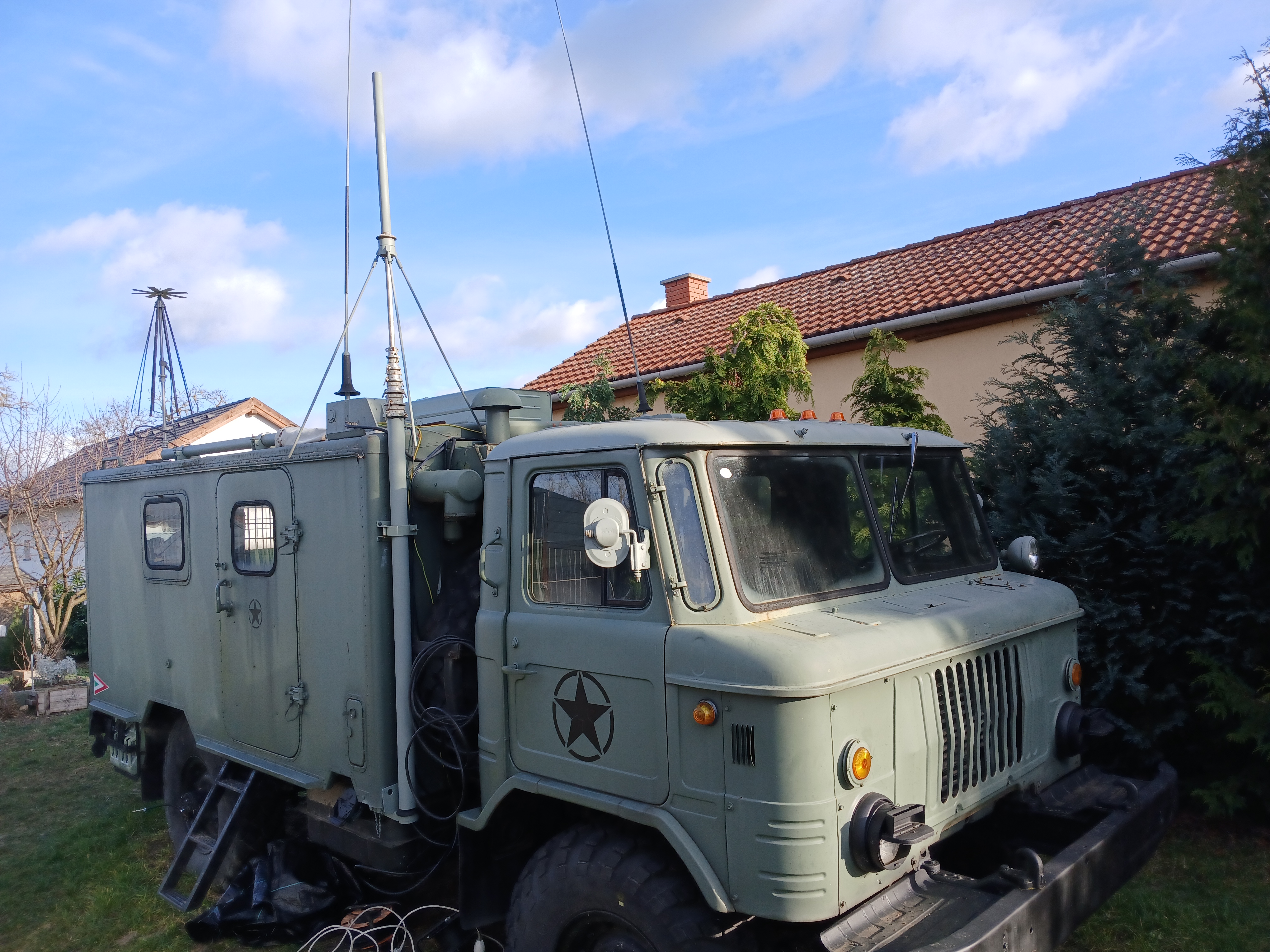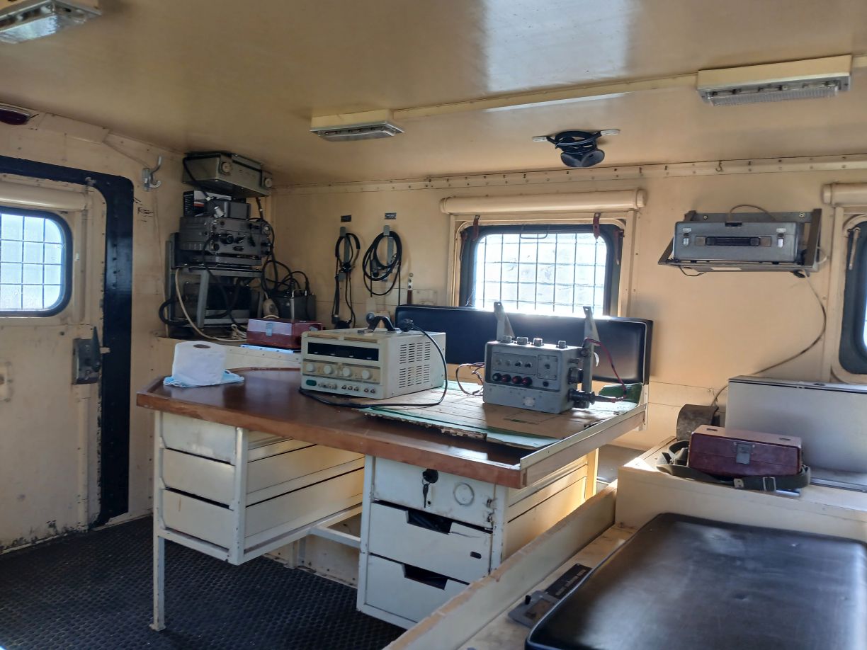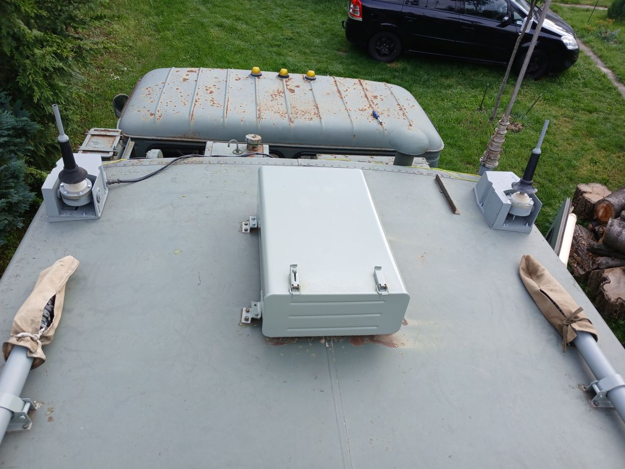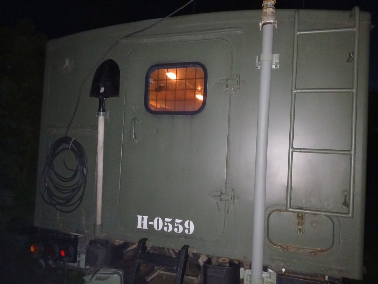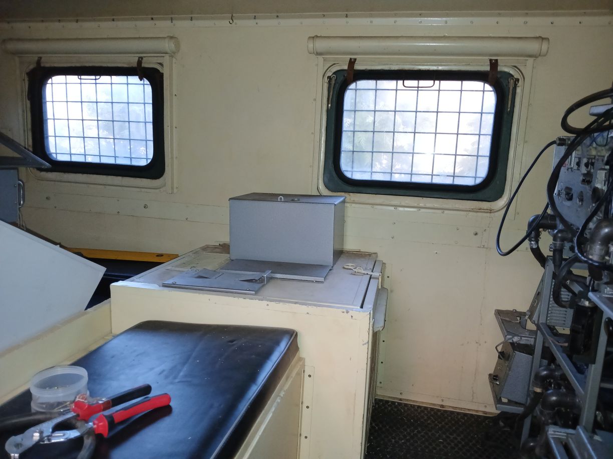 Egy üres GAZ-66 bódéval vettem, az elválasztó falat kivettem, így jobban jár a levegő benne, s jobban áttekinthető, komfortosabb lett a tér. Asztalt és padládát is beszereztem, s beépítettem az R-142 állomáshoz tartozó berendezésekkel együtt. Sajnos a jachta P-590 hiányzik belőle, de sebaj. A felépítményre felszereltem az antennák és árbócok nagy részét, áramfejlesztőt is beszereztem, orr generátort is beszereztem, kannákat is beszereztem hozzá. A kocsi műszerfalát nem bántom, de az odavaló egységeim megvannak.
